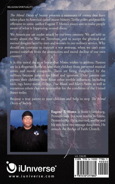 The Moral Decay of Society presents a summary of events that have taken place in America's jaded recent history. To the point and possibly offensive to some, author Eugene T Motes's essays aim to make people aware of what is happening around them. We Americans are under attack by our own country. We are told to worry about the War on Terrorism, and to accept the physical and mental dangers faced by men and women in our military service. Why should we continue to support a war overseas, when we can't even protect ourselves from the destruction and moral decline of our own country? It is this moral decay at home that Motes wishes to address. Parents are in a desperate battle to save their children from perverted musical artists and movie companies. Teens are being slaughtered by the millions because parents are blind and ignorant. Only parents can protect their children from Satan other terrible influences, including rock, rap, heavy metal, Eclipse, True Blood, and Harry Potter, as well as numerous others that are responsible for the condition of the United States today. Become a true parent to your children and help to stop The Moral Decay of Society.