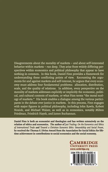 Disagreements about the morality of markets, and about self-interested behavior within markets, run deep. They arise from perspectives within economics and political philosophy that appear to have nothing in common. In this book, Daniel Finn provides a framework for understanding these conflicting points of view. Recounting the arguments for and against markets and self-interest, he argues that every economy must address four fundamental problems: allocation, distribution, scale, and the quality of relations. In addition, every perspective on the morality of markets addresses explicitly or implicitly the economic, political, and cultural contexts of markets, or what Finn terms 'the moral ecology of markets'. His book enables a dialogue among the various participants in the debate over justice in markets. In this process, Finn engages with major figures in political philosophy, including John Rawls, Robert Nozick, and Michael Walzer, as well as in economics, notably Milton Friedman, Friedrich Hayek, and James Buchannan.