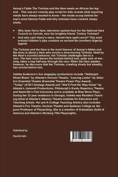 Why does Harry Hare, television spokes-hare for the National Hare Council on Carrots, race his longtime friend, Tommy Tortoise? And why can't Harry's niece, Harriet Hare spell carrot? This modernized children's play contains an ancient Ibo (northern Nigeria) legend. The Tortoise and the Hare is the most famous of Aesop's fables and the story is about a Hare who mocks a slow-moving Tortoise. Irked by the Hare's scornful behavior, the Tortoise challenges him to a race. The hare soon leaves the tortoise behind and, quite sure of winning, takes a nap half-way through the race. When the Hare awakes however, he discovers that the Tortoise, crawling slowly but steadily, has arrived before him. The moral of this story has always been ambiguous and Valletta Anderson's script throws light on the subject for questioning young minds. This is one of our scripts for plays with morals suitable for middle school. Suitable for outdoor performance.