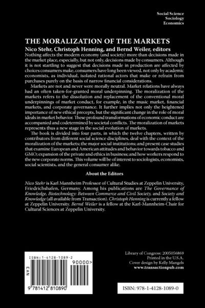 Nothing affects the modern economy (and society) more than decisions made in the market place, especially, but not only, decisions made by consumers. Although it is not startling to suggest that decisions made in production are affected by choices consumers make, consumers have long been viewed, not only by academic economists, as individual, isolated rational actors that make or refrain from purchases purely on the basis of narrow financial considerations. Markets are not and never were morally neutral. Market relations have always had an often taken-for-granted moral underpinning. The moralization of the markets refers to the dissolution and replacement of the conventional moral underpinnings of market conduct, for example, in the music market, financial markets, and corporate governance. It further implies not only the heightened importance of new ethical precepts, but the significant change in the role of moral ideals in market behavior. These profound transformations of economic conduct are accompanied and co-determined by societal conflicts. The moralization of markets represents thus a new stage in the social evolution of markets. The book is divided into four parts, in which the twelve chapters, written by contributors from different social science disciplines, deal with the context of the moralization of the markets; the major social institutions; and present case studies that examine European and American attitudes and behavior towards tobacco and GMO; expansion of the private and ethics in business; and how workers respond to the new corporate norms. This volume will be of interest to sociologists, economists, social scientists, and the general consumer alike.