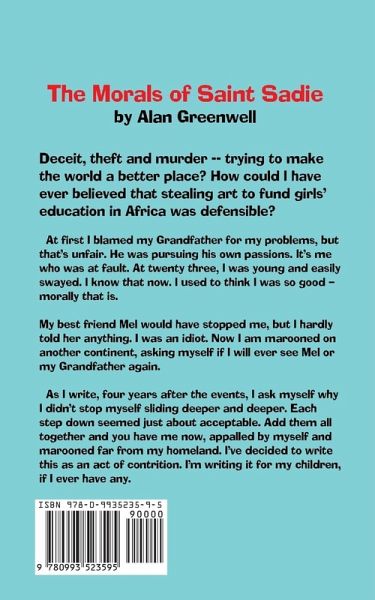 Deceit, theft and worse, but all in order to make the world a better place. How could Sadie have believed that stealing expensive paintings to fund girls' education in Africa was morally defensible? This novel is about art, about the funding of girls' education in the developing world -- and especially about morality. Sadie thought she was so upright but found herself slipping into a world where deceit, theft and worse seemed unavoidable. Later, marooned on another continent, she reflects on how her downfall came about and on how to redeem herself. At first she blamed her Grandfather for her problems. That was unfair; he was simply pursuing his own passions. Sadie realised too late that it was she who was at fault. At twenty three, she was young and too easily swayed. She used to think she was so good - morally that is. Her best friend Mel would have stopped her, had she confided in her. Now she is marooned on another continent, asking herself if she will ever see Mel or her Grandfather again. As she writes, four years after the events, she asks herself why she didn't stop herself from sliding deeper and deeper. Each step down seemed acceptable. Add them all together and you have her now, appalled by herself and marooned far from her homeland. She decided to write this as an act of contrition. She's writing it for her children, if she ever has any. This is Alan Greenwell's second novel.