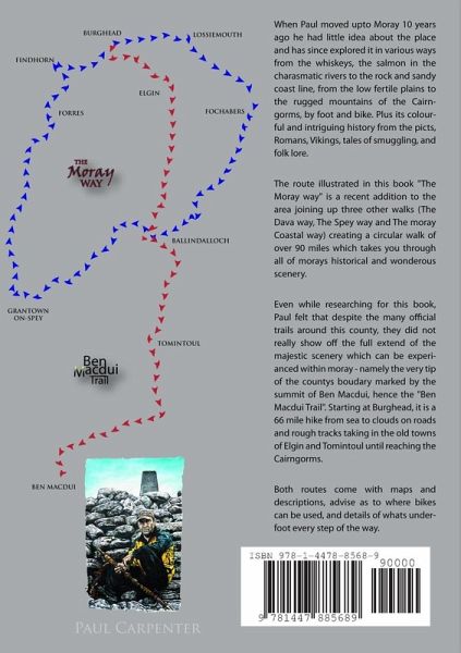 When the Author moved upto Moray 10 years ago he had little idea about the place and has since explored it in various ways from the whiskeys, the salmon in the charasmatic rivers to the rock and sandy coast line, from the low fertile plains to the rugged mountains of the Cairngorms, by foot and bike. Plus its colourful and intriguing history from the picts, Romans, Vikings, tales of smuggling, and folk lore. The route illustrated in this book ""The Moray way"", a circular walk of over 90 miles which takes you through all of morays historical and wonderous scenery. The second route is the ""Ben Macdui Trail"". Starting at Burghead, it is a 66 mile hike from sea to clouds on roads and rough tracks taking in the old towns of Elgin and Tomintoul until reaching the Cairngorms. Both routes come with maps and descriptions, advise as to where bikes can be used, and details of whats underfoot every step of the way.