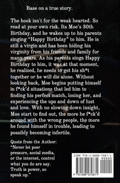 Base on a true story. It's Moe's 30th Birthday, and he wakes up to his parents singing "Happy Birthday" to him. He is still a virgin and has been hiding his virginity from his friends and family for many years. As his parents sings Happy Birthday to him, it was at that moment, he realized, he needs to get his sh*t together or he will die alone. Without looking back, Moe begins putting himself in f*ck'd situations that led him to finding his perfect match, losing her, and experiencing the ups and down of lust and love. With no slowing down insight, Moe start to find out, the more he f*ck'd around with the wrong people, the more he found himself in trouble, leading to possibly becoming infertile. Quote from the Author: "Never let peer pressure, social media, or the internet, control what you do are say. Truth is power, so speak up."