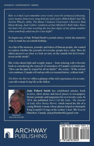 How is it that I can remember every word, every bit of musical phrasing, every nuance from every song from my early years (Mitch Ryder And The Detroit Wheels, Abba, The Band, Credence Clearwater's Revival's Bad Moon Rising, Judi Collins' rendition of Joni Mitchell's Both Sides Now) but had a bit of a time recalling the last four digits of our phone number when somebody asked me for it last night? So begins one of Judy Pollard Smith's journal entries, which she started to write to mark her seventieth birthday. As a fan of the memoirs, journals, and letters of famous people, she wanted to explore whether the journals of everyday people have value. How do others perceive us when we look seventy on the outside but feel twenty-seven on the inside? She writes about light and weighty topics - from relaxing with a favorite book to considering the removal of reminders of Canada's colonial past. "How can the past be erased for all its faults?" she writes. "If the current vein continues, Canada will end up with a revisionist history, without truth." The More the Merrier offers a glimpse of the rich experiences of a seventy-year-old woman living life to the fullest.