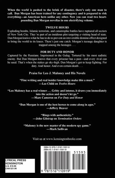 When the world is pushed to the brink of disaster, there’s only one man to call. Dan Morgan has been trained for any contingency and is prepared to risk everything—an American hero unlike any other. Now you can read two heart-pounding Dan Morgan novellas in one electrifying volume. TWELVE HOURS Exploding bombs, Islamic terrorists, and catastrophic battles have ruptured all sectors of New York City. They’re part of an insidious plot targeting a visiting head of state. Dan Morgan knows what he has to do to prevent an irreversible domino effect designed to bring the world to its knees. There’s just one catch. Morgan’s teenage daughter is trapped among the hostages . . . FOR DUTY AND HONOR Captured by the Russians. Imprisoned in the Gulag. Tortured by his most sadistic enemy. But Dan Morgan knows that every prisoner has a past—and every rival can be used. That’s when the stakes go sky-high. Dan Morgan’s got to keep fighting. For duty. And honor. And even certain death . . . Praise for Leo J. Maloney and His Novels "Fine writing and real insider knowledge make this a must."—Lee Child on Twelve Hours "Leo Maloney has a real winner . . . Gritty and intense, it draws you immediately into the action and doesn’t let go."—Marc Cameron on For Duty and Honor "Dan Morgan is one of the best heroes to come along in ages."—Jeffery Deaver "Rings with authenticity."—John Gilstrap on Termination Orders "Maloney is the new master of the modern spy game."—Mark Sullivan Visit us at www.kensingtonbooks.com