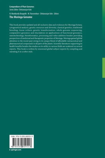 Chapter 1. Moringa and Its Importance.- Chapter 2. Botanical Descriptions of Moringa spp.- Chapter 3. Effect of Different Processing Methods on Nutritional Content of Moringa Oleifera.- Chapter 4. Medicinal and Therapeutic Properties of Moringa.- Chapter 5. Classical Genetics and Traditional Breeding in Moringa.- Chapter 6. Cytogenetical Analysis of Moringa Genome.- Chapter 7. Genetic Diversity of Moringa (Moringa oleifera Lam.).- Chapter 8. Tissue Culture and Genetic Engineering in Moringa.- Chapter 9. Molecular Markers and DNA Barcoding in Moringa.- Chapter 10. Genome Sequencing, Organellar Genomes and Comparative Genomics in Moringa.- Chapter 11. Moringa Functional Genomics: Implications of Long Read Sequencing Technologies.- Chapter 12. Bioinformatics Tools and Moringa Genomics.- Chapter 13. Biogenic Nanomaterials Using Moringa and their Applications.- Chapter 14. Moringa Processing and Value Addition: Rice Analogue from Broken Rice Fortified with Moringa Leaves and Its Effect on Iron Availability.- Chapter 15. Moringa and Its Genome: Future Prospects.