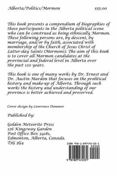 This book provides a compendium of biographies of those who are considered to be ethnically Mormon in Alberta who were involved in both provincial and federal politics over the past 120 years.