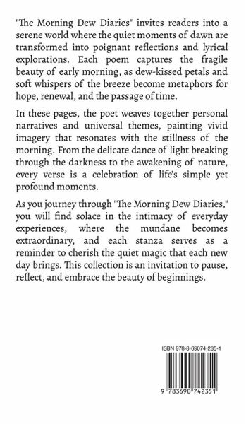 "The Morning Dew Diaries" invites readers into a serene world where the quiet moments of dawn are transformed into poignant reflections and lyrical explorations. Each poem captures the fragile beauty of early morning, as dew-kissed petals and soft whispers of the breeze become metaphors for hope, renewal, and the passage of time. In these pages, the poet weaves together personal narratives and universal themes, painting vivid imagery that resonates with the stillness of the morning. From the delicate dance of light breaking through the darkness to the awakening of nature, every verse is a celebration of life's simple yet profound moments. As you journey through "The Morning Dew Diaries," you will find solace in the intimacy of everyday experiences, where the mundane becomes extraordinary, and each stanza serves as a reminder to cherish the quiet magic that each new day brings. This collection is an invitation to pause, reflect, and embrace the beauty of beginnings.