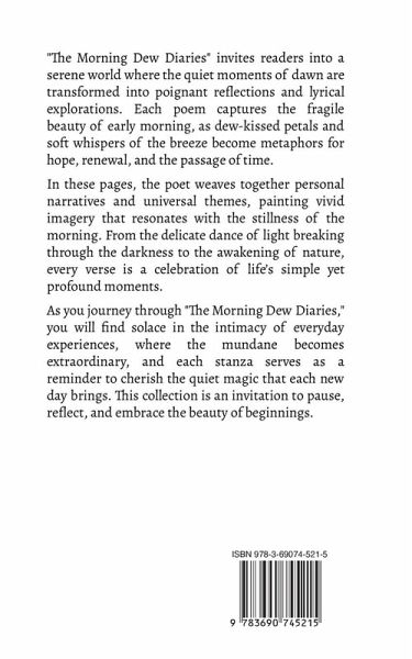 "The Morning Dew Diaries" invites readers into a serene world where the quiet moments of dawn are transformed into poignant reflections and lyrical explorations. Each poem captures the fragile beauty of early morning, as dew-kissed petals and soft whispers of the breeze become metaphors for hope, renewal, and the passage of time. In these pages, the poet weaves together personal narratives and universal themes, painting vivid imagery that resonates with the stillness of the morning. From the delicate dance of light breaking through the darkness to the awakening of nature, every verse is a celebration of life's simple yet profound moments. As you journey through "The Morning Dew Diaries," you will find solace in the intimacy of everyday experiences, where the mundane becomes extraordinary, and each stanza serves as a reminder to cherish the quiet magic that each new day brings. This collection is an invitation to pause, reflect, and embrace the beauty of beginnings.