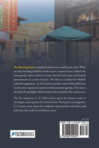 The Morning Dove is a madcap satire set in a small beach town. When an early morning small fire breaks out in a vacant theater, Mabel, the town gossip, starts a chain of events that has local, state, and federal governments in a state of panic. The fire is a catalyst for Mabel's colorful imagination. As the hysteria spreads, some of the politicians use the news reporters to promote their personal agendas. Not one to shy from the spotlight, Mabel seems to be everywhere the cameras are. The fire inspector, C. E. Hall, arrives upon the chaotic scene to investigate and separate fact from fiction. During his investigation, C. E. learns more about the residents' characteristics and often odd behaviors that make for a hilarious story.