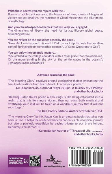The Morning Glory is a collection of poems, like a multi-hued garland, interlaced with the diverse thoughts and experiences nurtured in the author Ratan Kaul's life. Ratan's poems encompass the reflections on the grandeur of nature and the universe and its impact on the day-to-day lives of human beings. In this poetry book the readers can rejoice with the breeze of adolescent romance, the fragrance of love, sounds of bugles of victory and nationalism, the romance of cloud messenger, the allurement of mythology and several such heart touching themes. Also, they can introspect on the roar of the crumbling nature, the threat of world's extinction, the dimensions of liberty, the need for justice and Illusory global peace that will keep them engaged and inspired.