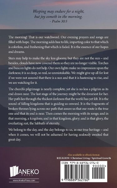 The morning! That is our watchword. Our evening prayers and songs are filled with hope. The morning adds hue to life, imparting color to that which is colorless, and freshening that which is faded. It is the essence of our hopes and dreams. Stars may help to make the sky less gloomy, but they are not the sun - and besides, clouds have now covered them so they are no longer visible. Torches and beacon lights do not help. Our own lights make no impression upon the darkness; it is so deep, so real, so unmistakable. We might give up all for lost if we were not assured that there is a sun and that…mehr
