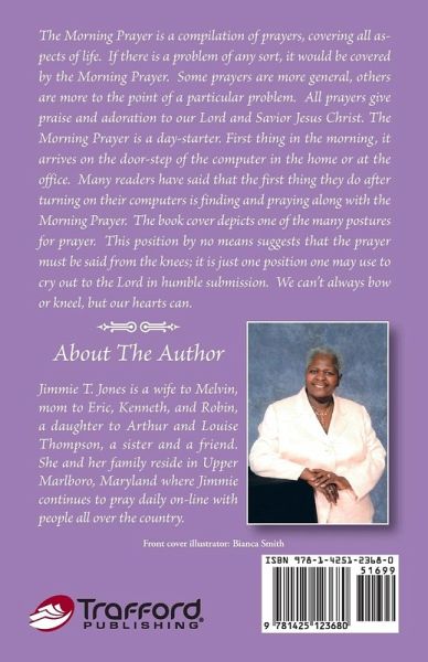 The Morning Prayer is a compilation of prayers, covering all aspects of life. If there is a problem of any sort, it would be covered by the Morning Prayer. Some prayers are more general, others are more to the point of a particular problem. All prayers give praise and adoration to our Lord and Savior Jesus Christ. The Morning Prayer is a day-starter. First thing in the morning, it arrives on the door-step of the computer in the home or at the office. Many readers have said that the first thing they do after turning on their computers is finding and praying along with the Morning Prayer. The book cover depicts one of the many postures for prayer. This position by no means suggests that the prayer must be said from the knees; it is just one position one may use to cry out to the Lord in humble submission. We can't always bow or kneel, but our hearts can.