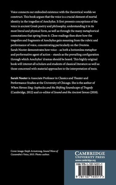 Voice connects our embodied existence with the theoretical worlds we construct. This book argues that the voice is a crucial element of mortal identity in the tragedies of Aeschylus. It first presents conceptions of the voice in ancient Greek poetry and philosophy, understanding it in its most literal and physical form, as well as through the many metaphorical connotations that spring from it. Close readings then show how the tragedies and fragments of Aeschylus gain meaning from the rubric and performance of voice, concentrating particularly on the Oresteia. Sarah Nooter demonstrates how voice - as both a bottomless metaphor and performative agent of action - stands as the prevailing configuration through which Aeschylus' dramas should be heard. This highly original book will interest all those interested in classical literature as well as those concerned with material approaches to the interpretation of texts.
