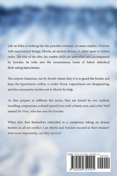 Life on Eden is nothing like the peaceful existence, its name implies. Overrun with supernatural beings, Mortis, an ancient demon, is called upon to restore order. The elite of the elite, his combat skills are unrivalled and, accompanied by Synclair, he treks into the mountainous home of Eden's diabolical flesh-eating leprechauns. The outpost Gamoran, run by dwarfs whose duty it is to guard the border and keep the leprechauns within, is under threat. Leprechauns are disappearing, and the community reaches out to Mortis for help. As they prepare to infiltrate the sector, they are joined by two unlikely travelling companions; a dwarf named Lynx with a bionic arm, and a dire Wolf named Da Vinci, who has eyes for Synclair. When they find themselves embroiled in a conspiracy, taking on demon hunters in all out conflict. Can Mortis and Synclair succeed in their mission? And more importantly, can they survive?