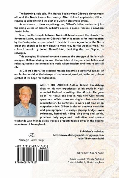 The haunting, epic tale, The Mosaic begins when Gilbert is eleven years old and the Nazis invade his country. After Holland capitulates, Gilbert returns to school to find the seat of a Jewish classmate empty. As resistance to the occupation grows, Gilbert's father, a minister, joins the rising voices of dissent. Gilbert's cousin, a nurse, rescues a newborn Jewish baby. Soon, conflict erupts between Nazi collaborators and the church. The Reverend Kwint, successor to Gilbert's father, is taken in for interrogation by the Gestapo for suspected aid to Jewish citizens. A year later, the Nazis order the church to be torn down to make way for the Atlantic Wall. The colossal mosaic by Johan Thorn-Prikker, depicting the Last Supper, is salvaged. This sweeping first-hand account narrates the struggle of life in Nazi-occupied Holland during the war, the hardship of the years that follow and raises questions that remain in a world where fascism and torture are still rife. In Gilbert's story, the rescued mosaic becomes a powerful symbol of our broken world, of the betrayal of our humanity and yet, in the end, also a symbol of the hope for redemption. ABOUT THE AUTHOR-Author Gilbert Creutzberg drew on his own experiences of his youth in Nazi-occupied Holland in writing The Mosaic. He grew up in The Hague and lives in New York City; having spent most of his career working in substance abuse rehabilitation, he continues to work part-time at an outpatient clinic. Gilbert is also an amateur musician and photographer. He enjoys playing bridge, loves swimming, horseback riding, ping-pong and tennis, practices daily yoga and meditation, and spends weekends with friends at his wooded property tucked away in the Pocono mountains of Pennsylvania. Publisher's website: http://www.strategicpublishinggroup.com/title/TheMosaic.html