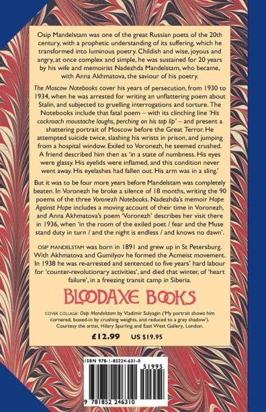 This edition combines two previous separate editions of The Moscow Notebooks and The Voronezh Notebooks published by Bloodaxe. The Moscow Notebooks cover his years of persecution (1930-34), when he was arrested for writing an unflattering poem about Stalin. In Voronezh he broke a silence of 18 months, writing the 90 poems of the Voronezh Notebooks.