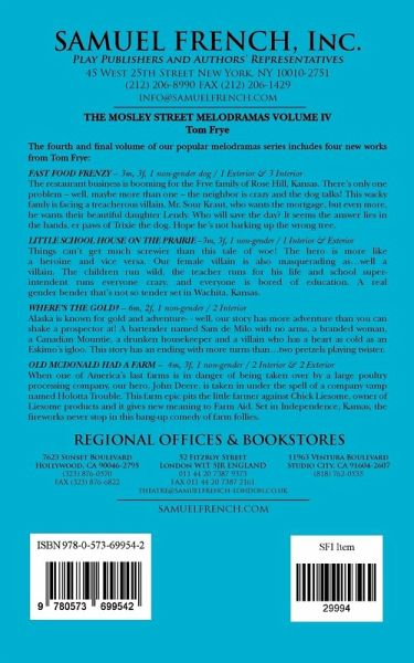 The fourth and final volume of our popular melodramas series includes four new works from Tom Frye: FAST FOOD FRENZY - 3 male, 3 female, 1 non-gender dog / 1 Exterior & 3 InteriorThe restaurant business is booming for the Frye family of Rose Hill, Kansas. There's only one problem - well, maybe more than one - the neighbor is crazy and the dog talks! This wacky famly is facing a treacherous villain, Mr. Sour Kraut, who wants the mortgage, but even more, he wants their beautiful d
