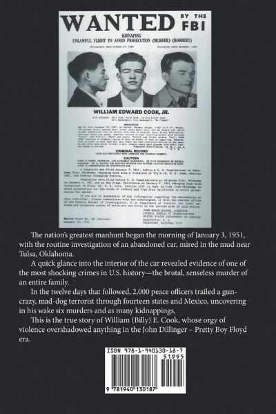 The nation's greatest manhunt began the morning of January 3, 1951, with the routine investigation of an abandoned car, mired in the mud near Tulsa, Oklahoma. A quick glance into the interior of the car revealed evidence of one of the most shocking crimes in U.S. history-the brutal, senseless murder of an entire family. In the twelve days that followed, 2,000 peace officers trailed a gun-crazy, mad-dog terrorist through fourteen states and Mexico, uncovering in his wake six murders and as many kidnappings, This is the true story of William (Billy) E. Cook, whose orgy of violence overshadowed anything in the John Dillinger - Pretty Boy Floyd era. Glenn Shirley, an award-winning author, is an authority on the American West, especially law and order in the Oklahoma and Indian territories. He has written hundreds of short stories, novelettes, and articles for magazines, journals, and anthologies, and more than two dozen books, including "Hello Sucker! The Story of Texas Guinan" and "Guardian of the Law: The Life and Times of William Matthew Tilghman." "The Fourth Guardsman: James Franklin "Bud" Ledbetter, 1882-1937," is the first and only detailed biography of one of the Old West's long neglected lawmen. All three are published by Eakin Press.
