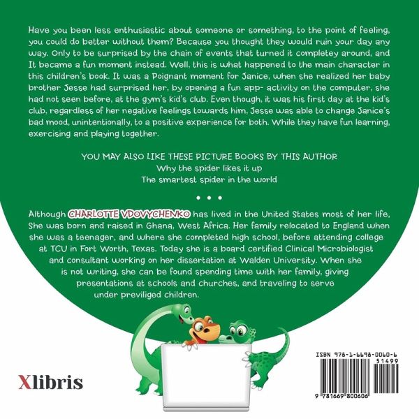 Have you been less enthusiastic about someone or something, to the point of feeling, you could do better without them? Because you thought they would ruin your day any way. Only to be surprised by the chain of events that turned it completely around, and It became a fun moment instead. Well, this is what happened to the main character in this children's book. It was a Poignant moment for Janice, when she realized her baby brother Jesse had surprised her, by opening a fun app- activity on the computer, she had not seen before, at the gym's kid's club. Even though, it was his first day at the kid's club, regardless of her negative feelings towards him, Jesse was able to change Janice's bad mood, unintentionally, to a positive experience for both. While they have fun learning, exercising and playing together. YOU MAY ALSO LIKE THESE PICTURE BOOKS BY THIS AUTHOR Why the spider likes it up The smartest spider in the world