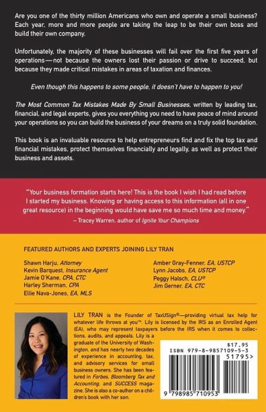 Are you one of the thirty million Americans who own and operate a small business? Each year, more and more people are taking the leap to be their own boss and build their own company. In 2010, there were 2.5 million new business applications filed in the U.S. Last year, there were over four million filed before we reached December. Unfortunately, the majority of these businesses will fail over the first five years of operations - not because the owners lost their passion or drive to succeed, but because they made critical mistakes in areas of taxation, finances, and funding. Every successful business must have a solid tax, financial, and legal foundation supporting the passion and potential so the organization can grow strong and prosper. What happens when a company's fundamental financial foundations are unstable? The business owner can experience stress, struggle, and strain, and their business can face tax assessments, audits, financial penalties, or even bankruptcy. Even though this happens to some people, it doesn't have to happen to you! The Most Common Tax Mistakes Made By Small Businesses, written by leading tax, financial, and legal experts, gives you the answers to questions such as:Do I set up an LLC or an S Corp to reduce my tax responsibility? Can I buy everything I want and write it off on my taxes? Do I really need to have a business insurance policy? I'm just starting out, do I need a plan for retirement? Who can help me if the IRS audits my company? Isn't tax planning just for huge corporations? This book is an invaluable resource to help entrepreneurs find and fix the top tax and financial mistakes, protect themselves financially and legally, as well as protect their business and assets. If you are a small business owner, or thinking of starting a new venture, the information in this book will give you everything you need to have peace of mind around your tax, financial, and legal operations so you can build the business of your dreams on a truly solid foundation.