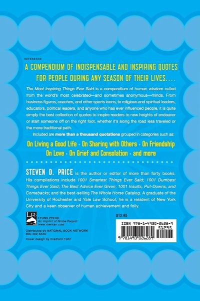 A compendium of indispensable and inspiring quotes for people during any season of their lives…. The Most Inspiring Things Ever Said is a compendium of human wisdom culled from the world’s most celebrated—and sometimes anonymous—minds. From business figures, coaches and other sports figures, religious and spiritual leaders, educators, political leaders, and anyone who has ever inspired people, it is quite simply the best collection of quotes to inspire readers to new heights of endeavor, or start someone off on the right foot, whether it’s along the road less traveled or the more traditional path. From Confucius and Shakespeare to Toni Morrison and Woody Allen, and from Winston Churchill and Thomas Edison to Jeff Bezos and Jerry Garcia, it is quite simply the best collection of quotes to inspire anyone.
