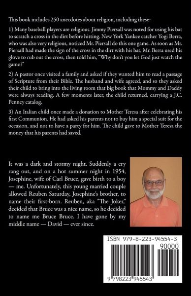 This book includes 250 anecdotes about religion, including this one: Many baseball players are religious. Jimmy Piersall was noted for using his bat to scratch a cross in the dirt before hitting. New York Yankee catcher Yogi Berra, who was also very religious, noticed Mr. Piersall do this one game. As soon as Mr. Piersall had made the sign of the cross in the dirt with his bat, Mr. Berra used his glove to rub out the cross, then told him, "Why don't you let God just watch the game?"
