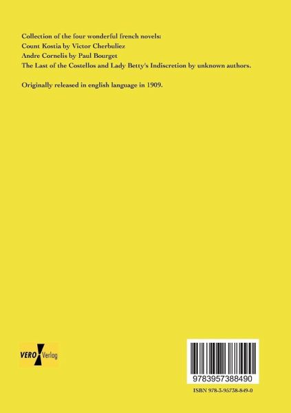 Collection of the four wonderful french novels: Count Kostia by Victor Cherbuliez Andre Cornelis by Paul Bourget The Last of the Costellos and Lady Betty's Indiscretion by unknown authors. Originally released in english language in 1909.