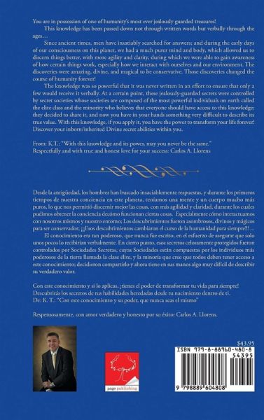 You are in possession of one of humanity's most ever jealously guarded treasures!This knowledge has been passed down not through written words but verbally through the ages...Since ancient times, men have insatiably searched for answers; and during the early days of our consciousness on this planet, we had a much purer mind and body, which allowed us to discern things better, with more agility and clarity, during which we were able to gain awareness of how certain things work, especially how we interact with ourselves and our environment. The discoveries were amazing, divine, and magical to be conservative. Those discoveries changed the course of humanity forever!The knowledge was so powerful that it was never written in an effort to ensure that only a few would receive it verbally. At a certain point, these jealously-guarded secrets were controlled by secret societies whose societies are composed of the most powerful individuals on earth called the elite class and the minority who believes that everyone should have access to this knowledge; they decided to share it, and now you have in your hands something very difficult to describe its true value.With this knowledge, if you apply it, you have the power to transform your life forever!Discover your inborn/inherited Divine secret abilities within you. With this knowledge and its power, may you never be the same. (KT) Respectfully and with true and honest love for your success,Carlos A. Llorens ¡Estás en posesión de uno de los tesoros celosamente guardados de los humanos!Este conocimiento ha sido transmitido, no escrito, sino verbalmente a través de los siglos...Desde la antigüedad, los hombres han buscado insaciablemente respuestas, y durante los primeros tiempos de nuestra conciencia en este planeta, teníamos una mente y un cuerpo mucho más puros, lo que nos permitió discernir mejor las cosas, con más agilidad y claridad, durante los cuales pudimos obtener la conciencia de cómo funcionan ciertas cosa, especialmente cómo interactuamos con nosotros mismos y nuestro entorno; los descubrimientos fueron asombrosos, divinos y mágicos para ser conservadores; ¡¡¡esos descubrimientos cambiaron el curso de la humanidad para siempre!!!Esos descubrimientos permitieron a los primeros hombres iluminados ejercitar algunas de nuestras santas habilidades dotadas y lograr algunos de los mayores logros jamás conocidos por la humanidad; el conocimiento era tan poderoso, que nunca fue escrito, en el esfuerzo de asegurar que solo aquellos que demostraron poseer los requisitos previos los recibirían verbalmente a través de un proceso de tutoría. En cierto punto, esos secretos celosamente guardados fueron controlados a través de lo que hoy conocemos como Sociedades Secretas, cuyas Sociedades están compuestas por los individuos más poderosos de la tierra llamada la clase élite, esta clase se divide en dos partes, la mayoría la cual cree que el resto de la población debe trabajar para ellos, ya que saben cómo manejar el planeta, y la minoría que cree que todos deben tener acceso a este conocimiento; gracias a su amor por la humanidad, decisión y voluntad de compartir este conocimiento, ahora tienen en sus manos algo muy difícil de describir, su verdadero valor.Con este conocimiento y si lo aplicas, ¡tienes el poder de transformar tu vida para siempre!