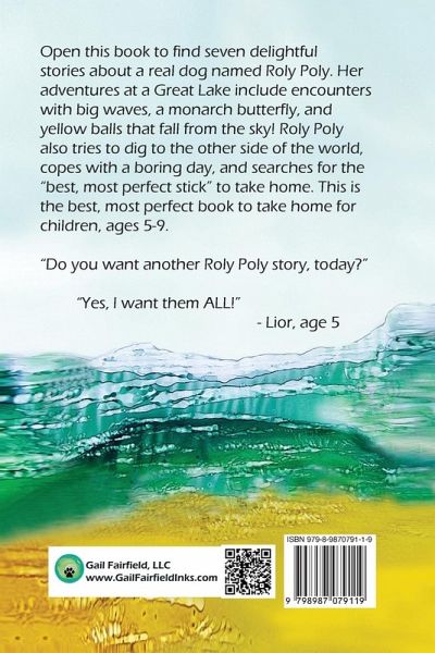 Open this book to find glorious artwork and seven delightful stories about a real dog named Roly Poly. With Granny Blue Jeans in tow, she tumbles into adventures in and around a Great Lake. These include encounters with big waves, a conversation with a monarch butterfly, and the discovery of mysterious yellow balls that fall from the sky! Roly Poly also tries to dig to the other side of the world, copes with a boring day, and searches for the "best, most perfect stick" to take home. Richly illustrated with alcohol ink and images of Roly Poly, this book captures the imagination of children and adults alike. For people who love images, the stories almost tell themselves through pictures. But then there are the words, evoking the sights, sounds, and smells of the beach and the natural environment around the lake. This is truly the best, most perfect book to take home for children, ages 5-9. You can read all the stories at once or savor them, one at a time. In any case, you'll want to read them, and fall into the illustrations, again and again. When he heard the first story, Lior (age five) was asked, "Do you want another Roly Poly story, today?" Spontaneously, he responded, "Yes, I want them ALL!" Lana (age nine) said, "I can't wait to read these to my kindergarten reading buddy." Back in the day, Gail Fairfield taught grades K-3 and raised a daughter, giving her ample opportunity to engage with children and read hundreds of children's books. She always wanted to try her hand at creating these stories, so after she retired, she wrote and illustrated a couple of books, just for family and friends. Then, she was adopted by Roly Poly, a nine-pound Yorkie-Maltese mix. The dog's antics inspired her to stretch her artistic and writing skills and to learn how to use the requisite software to create this book. Now retired, Gail has the freedom to express her creativity, travel, enjoy her grandchildren, and dig in the dirt of her garden. She engages with her Bloomington, Indiana community through participating in Women Writing for (a) Change and volunteer work involving children and/or art.