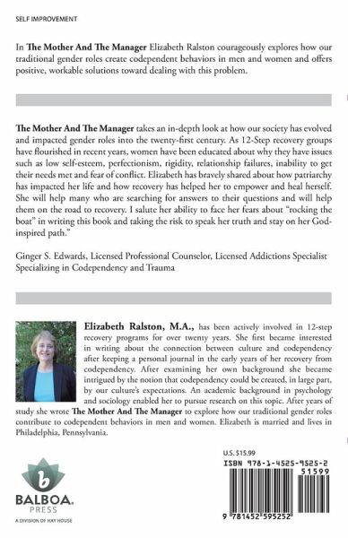 In The Mother And The Manager Elizabeth Ralston courageously explores how our traditional gender roles create codependent behaviors in men and women and offers positive, workable solutions toward dealing with this problem. The Mother And The Manager takes an in-depth look at how our society has evolved and impacted gender roles into the twenty-first century. As 12-Step recovery groups have flourished in recent years, women have been educated about why they have issues such as low self-esteem, perfectionism, rigidity, relationship failures, inability to get their needs met and fear of conflict. Elizabeth has bravely shared about how patriarchy has impacted her life and how recovery has helped her to empower and heal herself. She will help many who are searching for answers to their questions and will help them on the road to recovery. I salute her ability to face her fears about "rocking the boat" in writing this book and taking the risk to speak her truth and stay on her God-inspired path." Ginger S. Edwards, Licensed Professional Counselor, Licensed Addictions SpecialistSpecializing in Codependency and Trauma