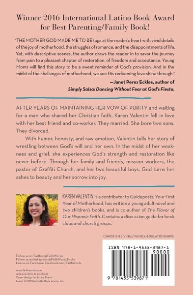 My journey from newlywed, to mother of two, to single mom - trying to heal - and become the mother God made me to be. Karen lived an adventurous single life but longed for a family of her own. After years of maintaining her vow of purity and waiting for a man who shared her Christian faith, she fell in love with her best friend and co-worker. They married. She bore two sons. They divorced. With humor, honesty and raw emotion, Valentin tells her story of wrestling between God's will and her own, with visions of happily ever after. In the midst of her weakness and grief, she experiences God's strength and restoration like never before. Through her family and friends, mission workers, the pastor of Graffiti Church, and her two beautiful boys, God turns her ashes to beauty and her sorrow into joy. THE MOTHER GOD MADE ME TO BE contains a discussion guide for book clubs and church groups. karenvalentin.com