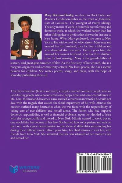 Mary Bottom-Tinsley, was born to Dock Fisher and Minerva Henderson-Fisher in the town of Jonesville, state of Louisiana. The youngest of twelve siblings. The only means of work in Jonesville were farming and domestic work, at which she worked harder than her other siblings due to the fact that she was the last one to leave home. When Mary graduated, she came to New York to live with one of her older sisters. Mary met and married her first husband, they had four children and were divorced after ten years. Twenty years later, she married her current husband, who has three children from his first marriage. Mary is the grandmother of sixteen, and great-grandmother of five. As the first lady of her church, she is a program organizer and a community activist. She loves people; she has a special passion for children. She writes poems, songs, and plays, with the hope of someday publishing them all. This play is based on (fiction and truth) a happily married Southern couple who are God-fearing people who encountered some happy times and some crucial times in life. Tom, the husband, became a naïve and self-centered man who felt he could not deal with the tragedy that caused the facial impairment of his wife. Minnie, the mother, suffered many heartaches when she was faced with the responsibility of taking care of two children and herself alone. The father, who had imposed domestic responsibility, as well as financial problems, upon her, decided to leave with the youngest child and moved to New York. Minnie wanted to work, but no one would hire her because of her face. She learned how to be patient and wait on the Lord, with a great determination to rise above all difficulties surrounding her during these difficult times. Fifteen years later, her child returns to visit her, with friends from New York. She admitted that she was ashamed of her mother's face and denied her.