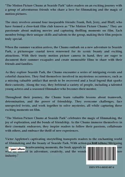 "The Motion Picture Chums at Seaside Park" takes readers on an exciting journey with a group of adventurous friends who share a love for filmmaking and the magic of motion pictures. The story revolves around four inseparable friends: Frank, Bob, Jerry, and Bluff, who have formed a close-knit film club known as "The Motion Picture Chums." They are passionate about making movies and capturing thrilling moments on film. Each member brings their unique skills and talents to the group, making their film projects truly special. When the summer vacation arrives, the Chums embark on a new adventure to Seaside Park, a picturesque coastal town renowned for its scenic beauty and exciting attractions. With their trusty motion picture camera in hand, they are eager to document their summer escapades and create memorable films to share with their friends and families. As they explore Seaside Park, the Chums encounter a series of intriguing events and colorful characters. They find themselves involved in mysterious occurrences, such as a missing valuable artifact that needs to be recovered and a local legend that sparks their curiosity. Along the way, they befriend a variety of people, including a talented young actress and a seasoned filmmaker who becomes their mentor. Throughout their journey, the Chums learn valuable lessons about teamwork, determination, and the power of friendship. They overcome challenges, face unexpected twists, and work together to solve mysteries, all while capturing these exciting moments on film. "The Motion Picture Chums at Seaside Park" celebrates the magic of filmmaking, the joy of exploration, and the bonds of friendship. As the Chums immerse themselves in their cinematic endeavors, they inspire readers to follow their passions, collaborate with others, and embrace the thrill of new experiences. Victor Appleton's captivating storytelling transports readers to the enchanting world of filmmaking and the beauty of Seaside Park. With action-packed scenes, intriguing mysteries, and heartwarming moments, the book appeals to young readers and anyone with an interest in adventure, creativity, and the wonders of the motion picture industry."