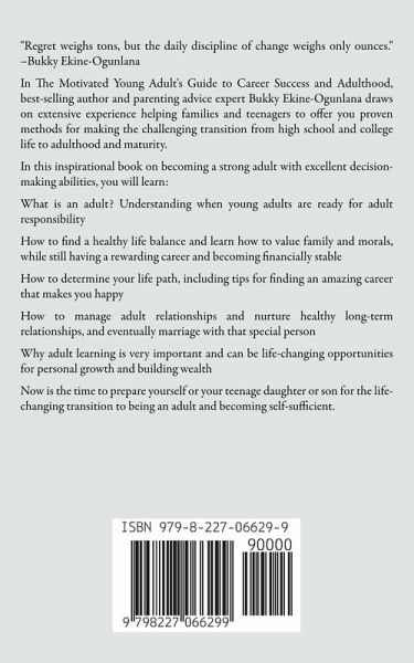 "Regret weighs tons, but the daily discipline of change weighs only ounces." -Bukky Ekine-Ogunlana In The Motivated Young Adult's Guide to Career Success and Adulthood, best-selling author and parenting advice expert Bukky Ekine-Ogunlana draws on extensive experience helping families and teenagers to offer you proven methods for making the challenging transition from high school and college life to adulthood and maturity. In this inspirational book on becoming a strong adult with excellent decision-making abilities, you will learn: What is an adult? Understanding when young adults are ready for adult responsibility How to find a healthy life balance and learn how to value family and morals, while still having a rewarding career and becoming financially stable How to determine your life path, including tips for finding an amazing career that makes you happy How to manage adult relationships and nurture healthy long-term relationships, and eventually marriage with that special person Why adult learning is very important and can be life-changing opportunities for personal growth and building wealth Now is the time to prepare yourself or your teenage daughter or son for the life-changing transition to being an adult and becoming self-sufficient. Page Up and Order Now.