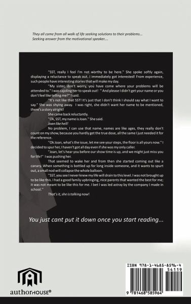 They all come from all walks of life seeking solutions to their problems . . . Seeking answers from the motivational speaker . . . "SST, really I feel I'm not worthy to be here," she spoke softly again, displaying a reluctance to speak out. I immediately got interested! From experience, such people have interesting stories that will make my day. "My sister, don't worry, you have come where your problems will be attended to." I was cajoling her to speak out! "And please, I didn't get your name, or you don't feel like telling me?" I said. "It's not like that, SST! It's just that I don't think I should say what I want to say." She was shying away. I was right. She didn't want her name to be mentioned, there's a story all right! She came back reluctantly. "OK. SST, my name is Joan," she said. Joan like hell! No problem, I can use that name. Names are like ages. They really don't count on my show because you hardly get the true dose, all the same I just needed it for the reference. "OK, Joan, what's the issue? Let me see your steps, the floor is all yours now." I decided to spur her. I haven't got all day even if she was my only caller. "Joan, let's hear you before our shot time is up, and we might just miss you for life." I was pushing her. That seemed to wake her, and from then, she started coming out like a canary. When something is bottled up for so long inside someone and it wants to spurt out, a small nod will collapse the whole balloon. "SST, you see, I never knew my life will drain to this level. I was not brought up to be like this. I had a good family upbringing, nice parents that wanted the best for me. It was not meant to be like this for me. I bet I was left astray by the company I made in school." That's it, she is talking now! You can't put it down once you start reading . . .