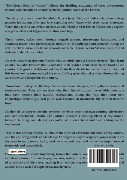 "The Motor Boys in Mexico" by Clarence Young is an adventurous tale that follows the escapades of three young friends-Jerry, Ned, and Bob-along with their companion, Professor Uriah Snodgrass, as they embark on a thrilling journey to Mexico. The story begins with the boys at a mining camp in Arizona, where they have successfully discovered a lost gold mine. Inspired by a story from Professor Snodgrass about a buried city in Mexico, the boys decide to set out on a new adventure to uncover this ancient mystery. Equipped with their trusty automobile, they navigate through the challenges of the wild terrain, facing natural obstacles and human threats alike. Their journey is marked by a series of exciting events, including a stormy crossing of the Rio Grande, where they encounter the enigmatic Don Alvarzo and his house-boat. Despite the hospitality offered, the boys are warned by Jones, the Don's manager, to be cautious of potential thieves. This warning proves prescient when a robber attempts to steal their money-belts during the night. Thanks to Ned's quick thinking, the thief is thwarted, and the boys continue their journey deeper into Mexico. As they travel, the boys are captivated by the beauty and mystery of the Mexican landscape, all the while keeping their ultimate goal in mind: the discovery of the buried city. The narrative is filled with suspense, humor, and the spirit of adventure, as the boys rely on their wits and camaraderie to overcome the challenges they face. Clarence Young weaves a tale that not only entertains but also highlights the themes of friendship, bravery, and the pursuit of knowledge.