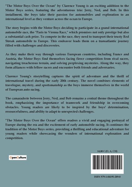 "The Motor Boys Over the Ocean" by Clarence Young is an exciting addition to the Motor Boys series, featuring the adventurous trio: Jerry, Ned, and Bob. In this installment, the boys take their passion for automobiles and exploration to an international level as they venture across the ocean to Europe. The story begins with the Motor Boys deciding to participate in a grand international automobile race, the "Paris to Vienna Race," which promises not only prestige but also a substantial cash prize. To compete in the race, they need to transport their trusty Red Streak automobile to Europe. This endeavor leads them on a transatlantic journey filled with challenges and discoveries. As they make their way through various European countries, including France and Austria, the Motor Boys find themselves facing fierce competition from rival racers, navigating treacherous terrain, and solving perplexing mysteries. Along the way, they form alliances with fellow racers and encounter both friends and adversaries. Clarence Young's storytelling captures the spirit of adventure and the thrill of international travel during the early 20th century. The novel combines elements of travelogue, mystery, and sportsmanship as the boys immerse themselves in the world of European auto racing. The camaraderie between Jerry, Ned, and Bob remains a central theme throughout the book, emphasizing the importance of teamwork and friendship in overcoming obstacles. Young readers are likely to be inspired by the boys' determination, resourcefulness, and ability to adapt to unexpected challenges. "The Motor Boys Over the Ocean" offers readers a vivid and engaging portrayal of Europe during the era and the excitement of early automobile racing. It continues the tradition of the Motor Boys series, providing a thrilling and educational adventure for young readers while showcasing the wonders of international exploration and competition.