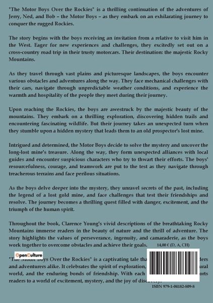"The Motor Boys Over the Rockies" is a thrilling continuation of the adventures of Jerry, Ned, and Bob ¿ the Motor Boys ¿ as they embark on an exhilarating journey to conquer the rugged Rockies. The story begins with the boys receiving an invitation from a relative to visit him in the West. Eager for new experiences and challenges, they excitedly set out on a cross-country road trip in their trusty motorcars. Their destination: the majestic Rocky Mountains. As they travel through vast plains and picturesque landscapes, the boys encounter various obstacles and adventures along the way. They face mechanical challenges with their cars, navigate through unpredictable weather conditions, and experience the warmth and hospitality of the people they meet during their journey. Upon reaching the Rockies, the boys are awestruck by the majestic beauty of the mountains. They embark on a thrilling exploration, discovering hidden trails and encountering fascinating wildlife. But their journey takes an unexpected turn when they stumble upon a hidden mystery that leads them to an old prospector's lost mine. Intrigued and determined, the Motor Boys decide to solve the mystery and uncover the long-lost mine's treasure. Along the way, they form unexpected alliances with local guides and encounter suspicious characters who try to thwart their efforts. The boys' resourcefulness, courage, and teamwork are put to the test as they navigate through treacherous terrains and face perilous situations. As the boys delve deeper into the mystery, they unravel secrets of the past, including the legend of a lost gold mine, and face challenges that test their friendships and resolve. The journey becomes a thrilling quest filled with danger, excitement, and the triumph of the human spirit. Throughout the book, Clarence Young's vivid descriptions of the breathtaking Rocky Mountains immerse readers in the beauty of nature and the thrill of adventure. The story highlights the values of perseverance, ingenuity, and camaraderie, as the boys work together to overcome obstacles and achieve their goals. "The Motor Boys Over the Rockies" is a captivating tale that captivates young readers and adventurers alike. It celebrates the spirit of exploration, the wonders of the natural world, and the enduring bonds of friendship. With each page, the story transports readers to a world of excitement, mystery, and the joy of discovery."