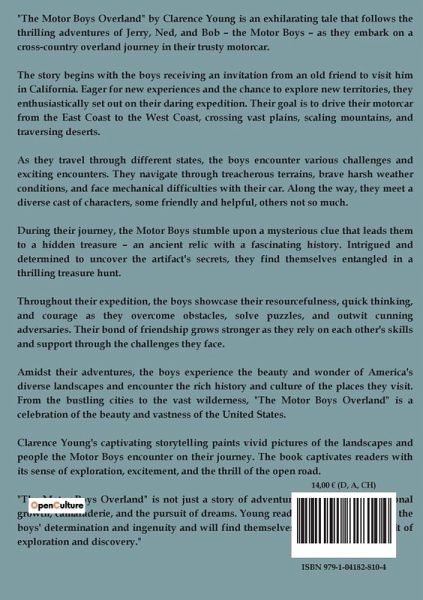 "The Motor Boys Overland" by Clarence Young is an exhilarating tale that follows the thrilling adventures of Jerry, Ned, and Bob ¿ the Motor Boys ¿ as they embark on a cross-country overland journey in their trusty motorcar. The story begins with the boys receiving an invitation from an old friend to visit him in California. Eager for new experiences and the chance to explore new territories, they enthusiastically set out on their daring expedition. Their goal is to drive their motorcar from the East Coast to the West Coast, crossing vast plains, scaling mountains, and traversing deserts. As they travel through different states, the boys encounter various challenges and exciting encounters. They navigate through treacherous terrains, brave harsh weather conditions, and face mechanical difficulties with their car. Along the way, they meet a diverse cast of characters, some friendly and helpful, others not so much. During their journey, the Motor Boys stumble upon a mysterious clue that leads them to a hidden treasure ¿ an ancient relic with a fascinating history. Intrigued and determined to uncover the artifact's secrets, they find themselves entangled in a thrilling treasure hunt. Throughout their expedition, the boys showcase their resourcefulness, quick thinking, and courage as they overcome obstacles, solve puzzles, and outwit cunning adversaries. Their bond of friendship grows stronger as they rely on each other's skills and support through the challenges they face. Amidst their adventures, the boys experience the beauty and wonder of America's diverse landscapes and encounter the rich history and culture of the places they visit. From the bustling cities to the vast wilderness, "The Motor Boys Overland" is a celebration of the beauty and vastness of the United States. Clarence Young's captivating storytelling paints vivid pictures of the landscapes and people the Motor Boys encounter on their journey. The book captivates readers with its sense of exploration, excitement, and the thrill of the open road. "The Motor Boys Overland" is not just a story of adventure; it is a story of personal growth, camaraderie, and the pursuit of dreams. Young readers will be inspired by the boys' determination and ingenuity and will find themselves immersed in the spirit of exploration and discovery."