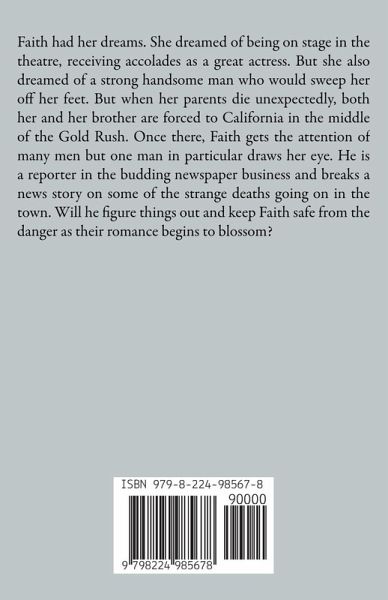 Faith had her dreams. She dreamed of being on stage in the theatre, receiving accolades as a great actress. But she also dreamed of a strong handsome man who would sweep her off her feet. But when her parents die unexpectedly, both her and her brother are forced to California in the middle of the Gold Rush. Once there, Faith gets the attention of many men but one man in particular draws her eye. He is a reporter in the budding newspaper business and breaks a news story on some of the strange deaths going on in the town. Will he figure things out and keep Faith safe from the danger as their romance begins to blossom?