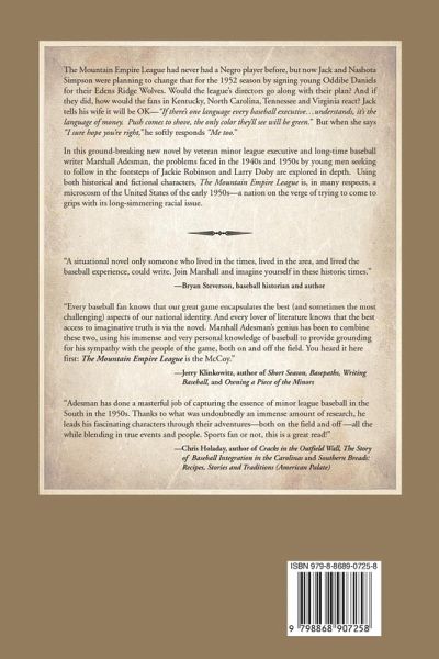 Born and raised in Brooklyn, New York, Marshall Adesman will always have one leg in the North. But having spent more than half his life below the Mason-Dixon line, the other leg is most definitely planted in the South. He spent a dozen years in minor league baseball, working as an assistant general manager, general manager and business manager for teams located in St. Petersburg, Florida; Amarillo, Texas; Waterloo, Iowa; Utica, New York; Pulaski, Virginia; and three cities in the State of North Carolina-Durham, Greensboro and Raleigh. Many of the incidents found in The Mountain Empire League are based on things he experienced, either directly or indirectly, during his time in the game, and many of the characters found in the book are based on people he knew and worked with in those towns. He is also the co-author of an historical book, The 25 Greatest Baseball Teams of the 20th Century Ranked, contributed to two other nonfiction works, and served as an associate editor on the two-volume history, Baseball's Business: The Winter Meetings. After 21 years at Duke University, he and his wife retired to the beautiful mountains of Northeast Tennessee in 2009.