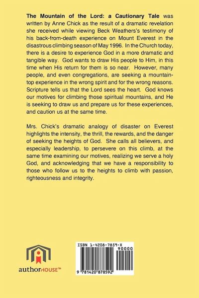 The Mountain of the Lord: a Cautionary Tale was written by Anne Chick as the result of a dramatic revelation she received while viewing Beck Weathers's testimony of his back-from-death experience on Mount Everest in the disastrous climbing season of May 1996. In the Church today, there is a desire to experience God in a more dramatic and tangible way. God wants to draw His people to Him, in this time when His return for them is so near. However, many people, and even congregations, are seeking a mountain-top experience in the wrong spirit and for the wrong reasons. Scripture tells us that the Lord sees the heart. God knows our motives for climbing those spiritual mountains, and He is seeking to draw us and prepare us for these experiences, and caution us at the same time. Mrs. Chick's dramatic analogy of disaster on Everest highlights the intensity, the thrill, the rewards, and the danger of seeking the heights of God. She calls all believers, and especially leadership, to persevere on this climb, at the same time examining our motives, realizing we serve a holy God, and acknowledging that we have a responsibility to those who follow us to the heights to climb with passion, righteousness and integrity.