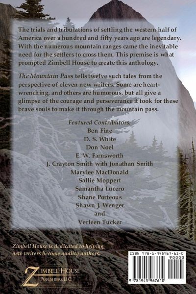 The trials and tribulations of settling the western half of America over a hundred and fifty years ago are legendary. With the numerous mountain ranges came the inevitable need for the settlers to cross them. This premise is what prompted Zimbell House to create this anthology. The Mountain Pass tells twelve such tales from the perspective of eleven new writers. Some are heart-wrenching, and others are humorous, but all give a glimpse of the courage and perseverance it took for these brave souls to make it through the mountain pass. Featured Contributors: Ben Fine D. S. White Don Noel E. W. Farnsworth J. Crayton Smith with Jonathan Smith Marylee MacDonald Sallie Moppert Samantha Lucero Shane Porteous Shawn J. Wenger and Verleen Tucker Zimbell House is dedicated to helping new writers become quaility authors.