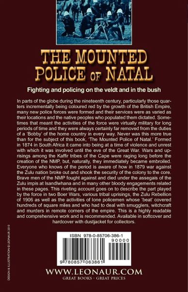 Fighting and policing on the veldt and in the bush In parts of the globe during the nineteenth century, particularly those quarters incrementally being coloured red by the growth of the British Empire, many new police forces were formed and their services were as varied as their locations and the native peoples who populated them dictated. Sometimes that meant the activities of the force were virtually military for long periods of time and they were always certainly far removed from the duties of a 'Bobby' of the home country in every way. Never was this more true than for the subject of this book, 'The Mounted Police of Natal.' Formed in 1874 in South Africa it came into being at a time of violence and unrest with which it was involved until the eve of the Great War. Wars and uprisings among the Kaffir tribes of the Cape were raging long before the creation of the NMP, but, naturally, they immediately became embroiled. Everyone who knows of the period is aware of how in 1879 war against the Zulu nation broke out and shook the security of the colony to the core. Brave men of the NMP fought against and died under the assegais of the Zulu impis at Isandlwhana and in many other bloody engagements related in these pages. This riveting account goes on to describe the part played by the force in two Boer Wars, various tribal uprisings, the Zulu Rebellion of 1906 as well as the activities of lone policemen whose 'beat' covered hundreds of square miles and who had to deal with smugglers, witchcraft and murders in remote corners of the empire. This is a highly readable and comprehensive work and is recommended. Available in softcover and hardcover with dustjacket for collectors.
