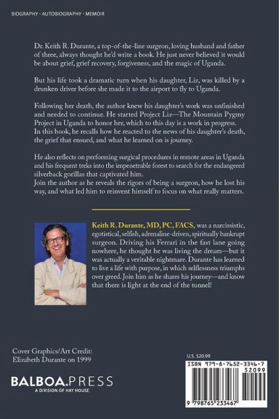 Dr. Keith R. Durante, a top-of-the-line surgeon, loving husband and father of three, always thought he'd write a book. He just never believed it would be about grief, grief recovery, forgiveness, and the magic of Uganda. But his life took a dramatic turn when his daughter, Liz, was killed by a drunken driver before she made it to the airport to fly to Uganda. Following her death, the author knew his daughter's work was unfinished and needed to continue. He started Project Liz-The Mountain Pygmy Project in Uganda to honor her, which to this day is a work in progress. In this book, he recalls how he reacted to the news of his daughter's death, the grief that ensued, and what he learned on is journey. He also reflects on performing surgical procedures in remote areas in Uganda and his frequent trips into the impenetrable forest to search for the silverback gorillas that captivated him. Join the author as he reveals the rigors of being a surgeon, how he lost his way, and what led him to reinvent himself to focus on what really matters.