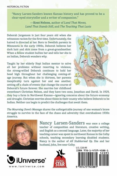 Deborah Jorgenson is just four years old when she witnesses racism for the first time. Unfortunately, the hatred is directed at her. Born to Swedish parents in Minnesota in the early 1900s, Deborah believes her dark hair and skin come from a great-grandmother. When a fellow student bullies her and tells her she is an Indian, Deborah wonders why. Taught by her elderly Hopi Indian mentor to solve all her problems without resorting to violence, the strong-willed Deborah continues to hold her head high throughout her challenging coming-of-age journey. But when she is thirteen, her parents inexplicably turn against her and one another, setting off a chain of events that change the course of Deborah's future forever. She marries her childhood sweetheart Christian Nelson, and they have two sons, Jonathan and David. In 1929, they buy a farm in Northwest Kansas-ignoring concerns about the future economy and drought. Christian worries about those in their county who believe Deborah to be Indian. Neither can begin to predict the challenges that await them. The Mourning Dove's Message shares the unforgettable journey of one woman's brave struggle to survive in the face of the chaos and adversity that overshadows 1930s America.