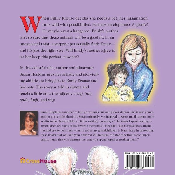 When Emily Krouse decides she needs a pet, her imagination runs wild with possibilities. Perhaps an elephant? A giraffe? Or maybe even a kangaroo! Emily's mother isn't so sure that these animals will be a good fit. In an unexpected twist, a surprise pet actually finds Emily-and it's just the right size! Will Emily's mother agree to let her keep this perfect, new pet? In this colorful tale, author and illustrator Susan Hopkins uses her artistic and storytelling abilities to bring life to Emily Krouse and her pets. The story is told in rhyme and teaches little ones the adjectives big, tall, wide, high, and tiny.