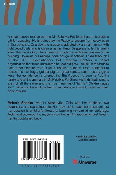 A small, brown mouse born in Mr. Pajolly's Pet Shop has an incredible gift for escaping. He is trained by his Pappy to escape from every cage in the pet shop. One day, the mouse is adopted by a small human with tight blond curls and is given a name, Hero. Desperate to let his family know that he is okay, Hero travels through the ventilation system of the building. However, his escape does not go unnoticed. Three black rats of the RPFF-Revolutionary Pet Freedom Fighters-a secret organization that frees mistreated household pets-enlist Hero's help to save other animals from cruel, senseless humans. From hamsters to horses, fish to frogs, guinea pigs to great danes, each escape gives Hero the confidence to attempt the Big Rescue-a plan to free his family and all the animals in Mr. Pajolly's Pet Shop. He finds that humans are not all the same and the true meaning of 'family". Children ages 7-11 will enjoy this wildly adventurous tale from a small, brown mouse's point of view.