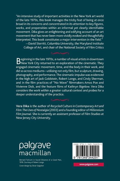 Beginning in the late 1970's, a number of visual artists in downtown New York City returned to an exploration of the cinematic. They engaged cinematic movement, time, and the body in their work, and did so across mediums - utilizing not only film, but sculpture, drawing, photography, and performance. The cinematic impulse was evidenced in the high art of Jack Goldstein, Robert Longo, and Cindy Sherman, and in the film practices of "No Wave" filmmakers Amos Poe and Vivienne Dick, and the feature films of Kathryn Bigelow. Vera Dika considers the work within a greater cultural context and probes for a deeper understanding of the practice.